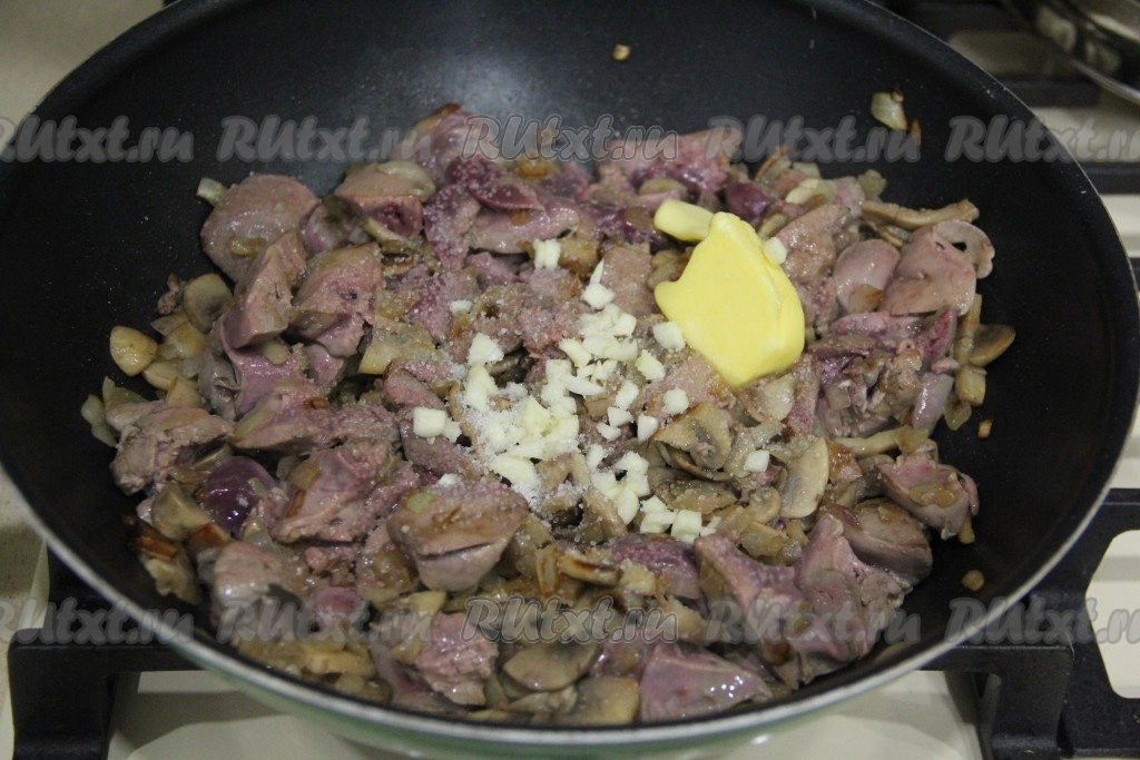 Обжарить куриную печень в середине сковороды на сильном огне, помешивая, примерно, 2-3 минуты. Затем перемешать печёнку с шампиньонами и луком, добавить сливочное масло и измельчённый чеснок, посолить по вкусу.