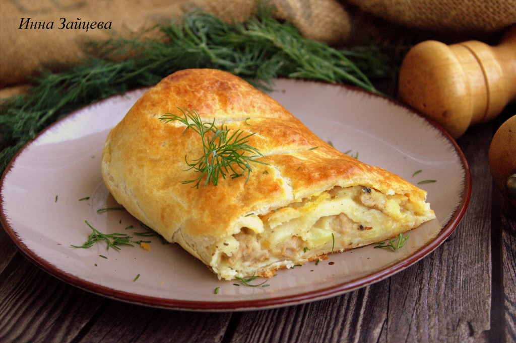 Сытный, аппетитный пирог с картошкой и мясом из слоёного дрожжевого теста готов. Дайте выпечке слегка остыть и подавайте к столу в тёплом виде.
