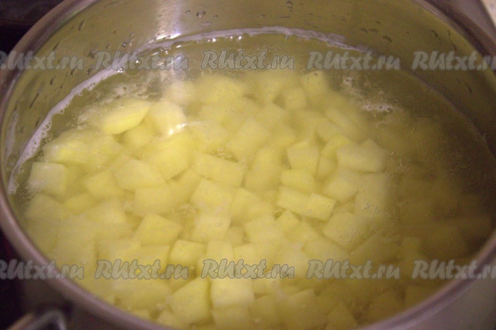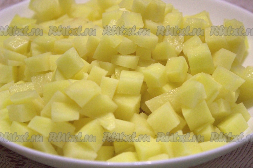 Тем временем картофель вымыть, очистить, нарезать на кубики среднего размера (можно варить очищенный картофель и целиком, но тогда время варки немного увеличится). Если у вас есть картофельное пюре, оставшееся с обеда или ужина, то можно его использовать в начинку.