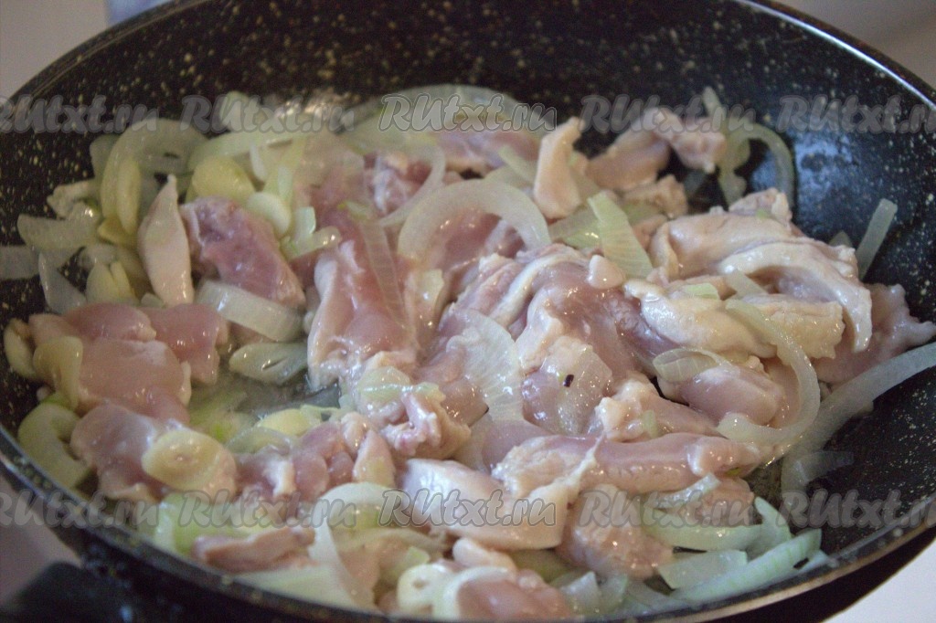 В сковороду к луку добавить нарезанное на небольшие кусочки мясо, уменьшить огонь до среднего, приправить и посолить по вкусу. Обжаривать мясо с луком, примерно, минут 7-10, иногда помешивая, затем убрать с огня и оставить до полного остывания.