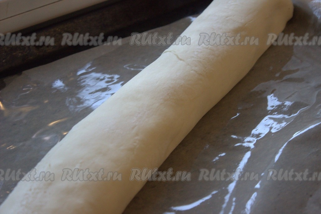 Свернуть слоёное тесто с начинкой в рулет, начиная с длинного края. Защипнуть края и подогнуть. Выложить пирог с картошкой и мясом на противень, застеленный пергаментной бумагой. Если пергамент не очень хорошего качества, то предварительно смажьте его растительным маслом.
