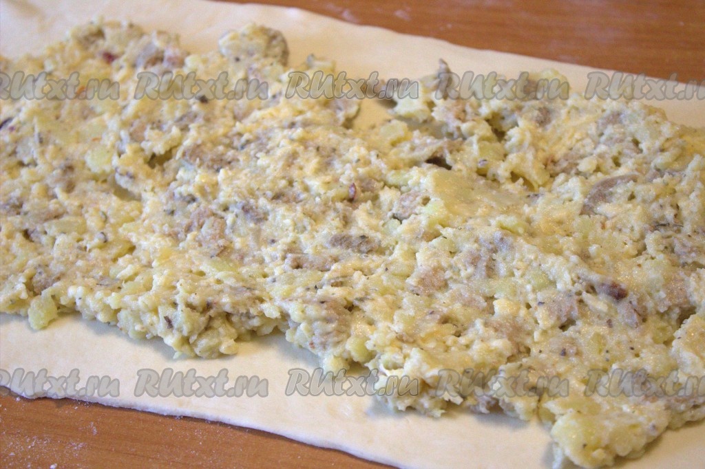 Рабочую поверхность припылить мукой, размороженное слоёное тесто раскатать в один пласт толщиной 2-3 миллиметра (у меня получился пласт размером 30 см на 50 см). Я делала один длинный пирог, но можно с таким же успехом сделать два пирога меньшего размера, разделив тесто на два пласта. Выложить картофельно-мясную начинку на раскатанное слоёное тесто, немного отступив от краёв.