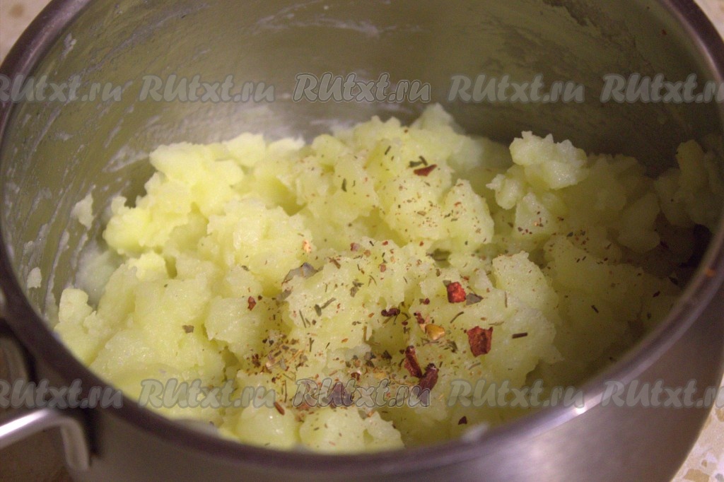 Когда картошка будет готова, полностью слить воду, добавить сливочное мало, специи (я добавила универсальную приправу). Размять картошку толкушкой в пюре и дать остыть.