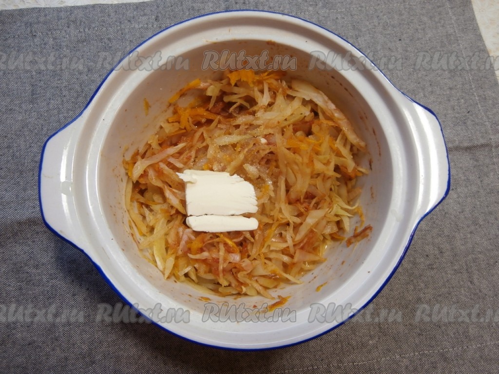 Капусту перемешать, всыпать сахар, перемешать, добавить кусочек сливочного масла.