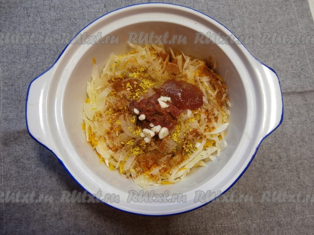 Влить воду, накрыть кастрюльку крышкой и отправить в микроволновую печь на 8 минут при мощности СВЧ 750 Ватт. Затем добавить в капусту томатную пасту и кетчуп, чёрный молотый перец, нарезанный чеснок, соль, паприку и приправу для овощей.