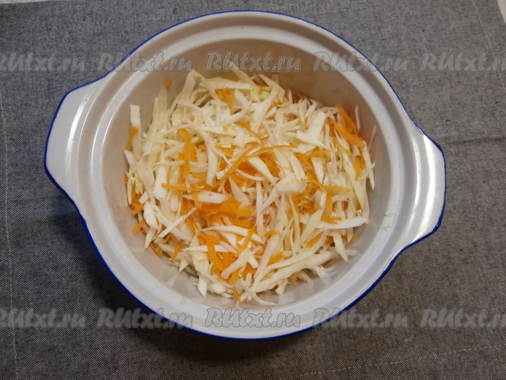 Морковь, чеснок и лук очистить. Капусту нашинковать, перемешать её с натёртой на крупной тёрке морковью, выложить в небольшую кастрюльку (или миску), предназначенную для готовки в микроволновке.