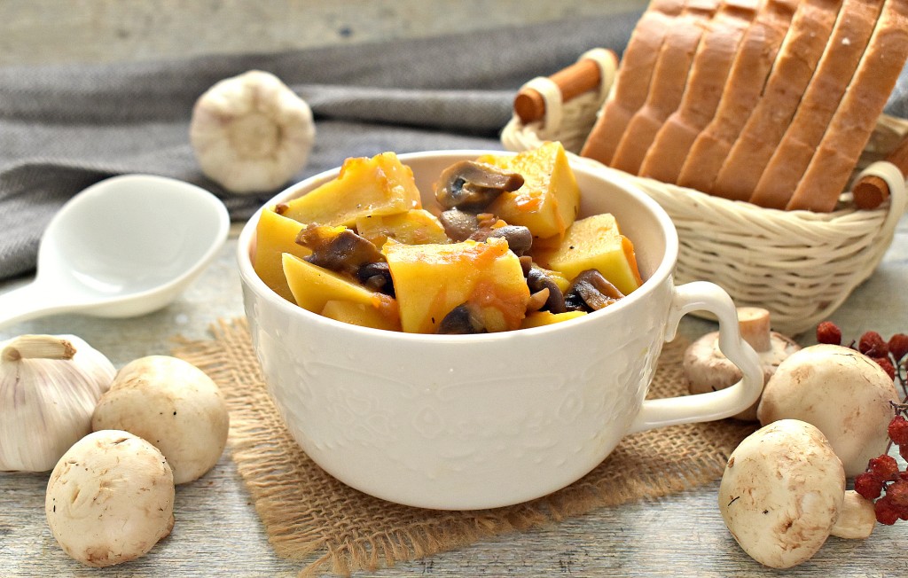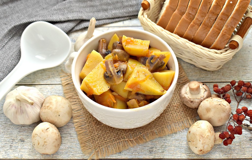 После звукового сигнала вкусная, аппетитная картошка, тушёная с шампиньонами в мультиварке, будет готова. Хотя это блюдо постное, оно прекрасно насыщает, картошечка получается мягкой, с наивкуснейшей подливой и буквально тающими во рту грибочками.