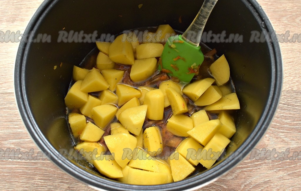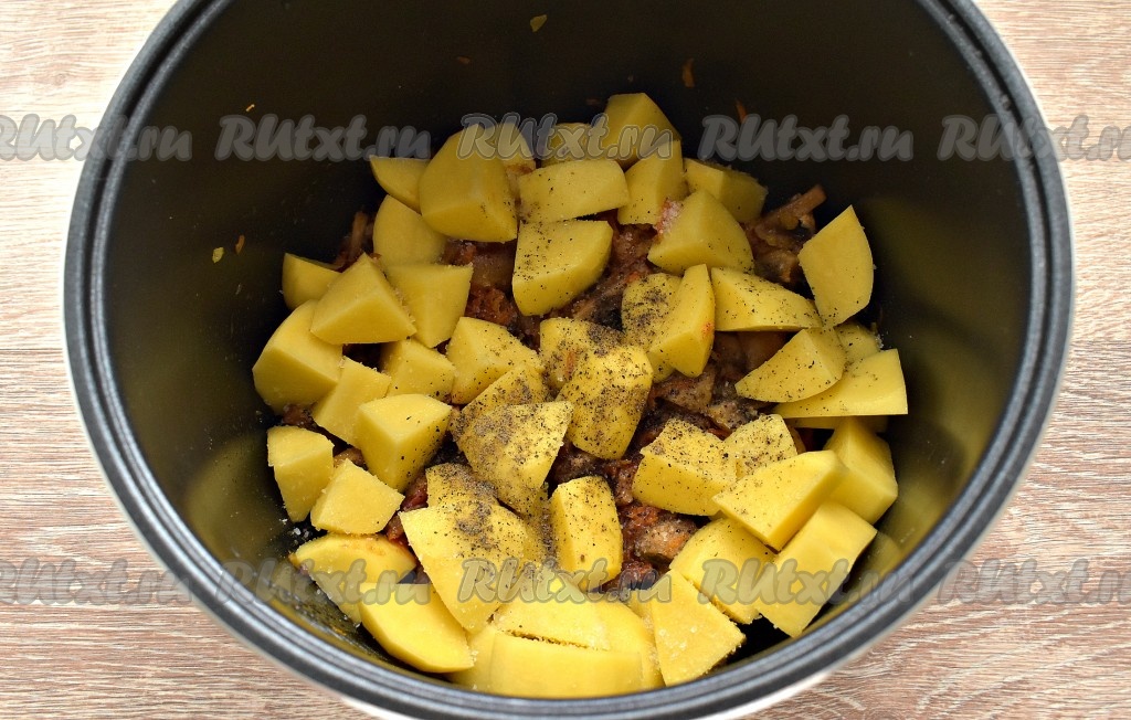 Крупными кубиками нарезаем картошку и выкладываем в чашу мультиварки, по вкусу солим, перчим.