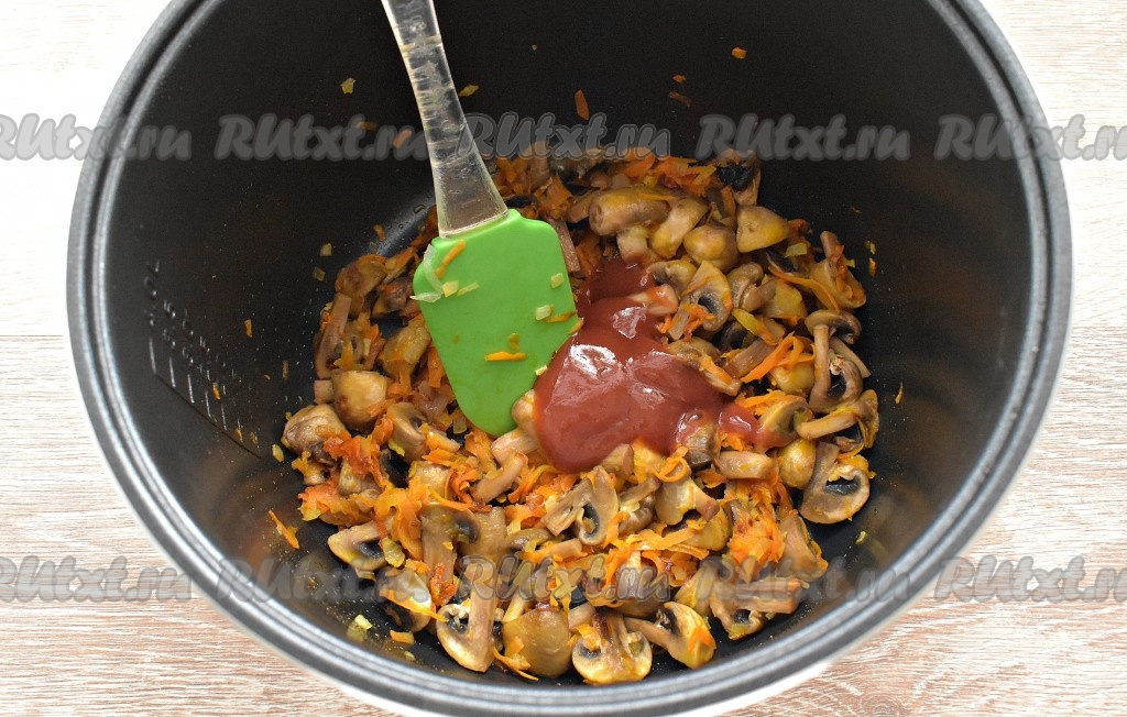 К овощам и шампиньонами добавляем томатную пасту, перемешиваем. Томим ещё пару минут.