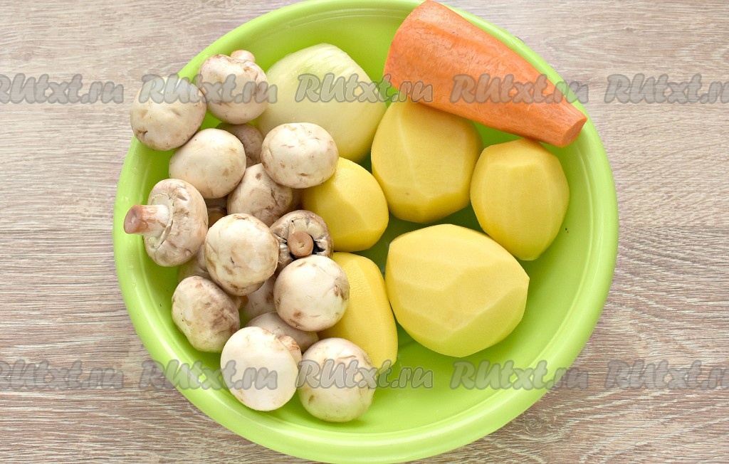 Очищаем картофель, морковку и лук, ополаскиваем. Шампиньоны тоже промываем водой, удаляя загрязнения на грибах. Картошины залейте водой, чтобы они не потемнели, пока мы будем обжаривать другие овощи и грибы.