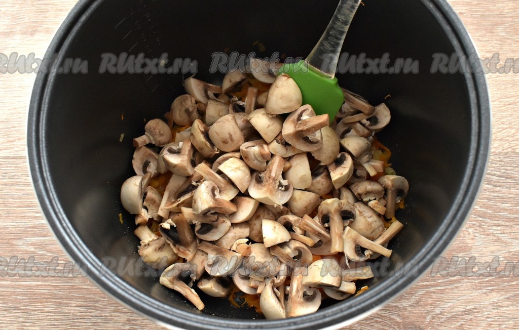 Шампиньоны нарезаем четвертинками. Перекладываем грибы в чашу к овощам и обжариваем, иногда перемешивая, минут 5.