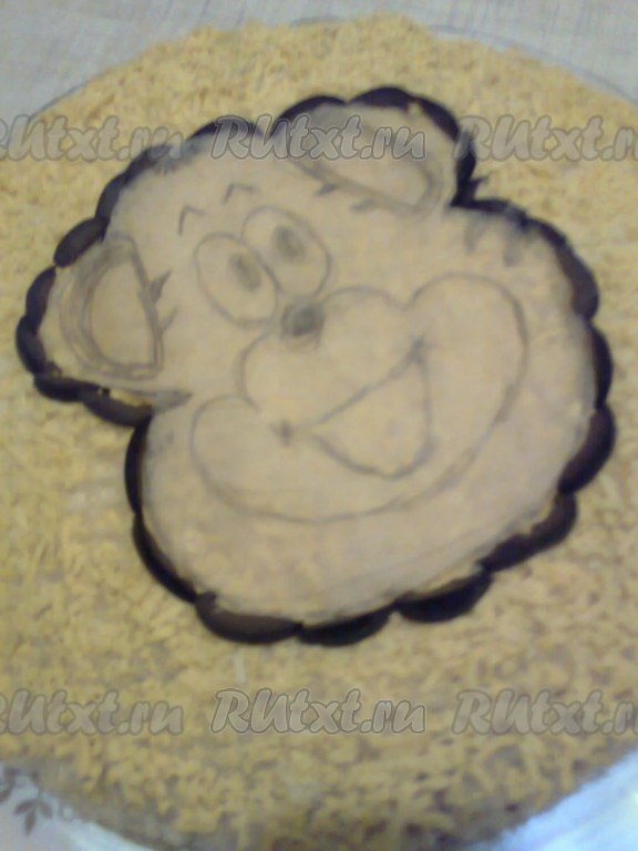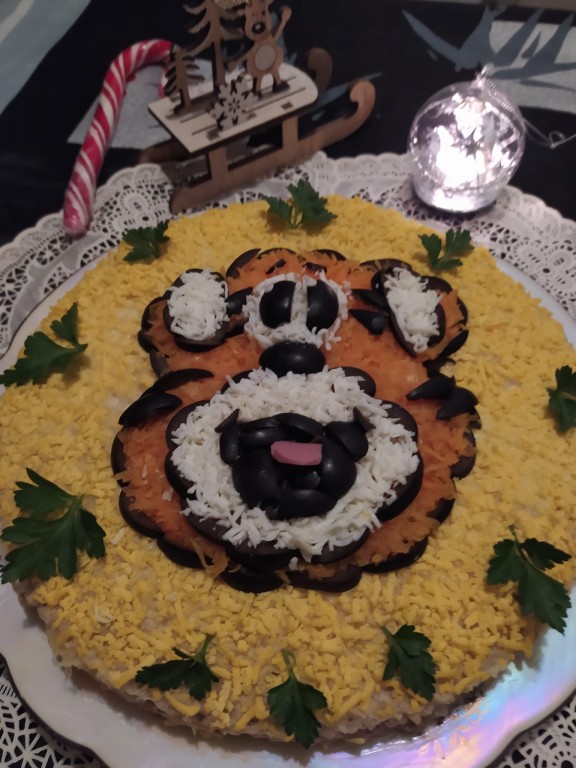 Для украшения вырезать трафарет мордочки тигрёнка. Приложить к центру закусочного торта. Сделать контур вокруг трафарета из нарезанных маслин (или из чернослива).