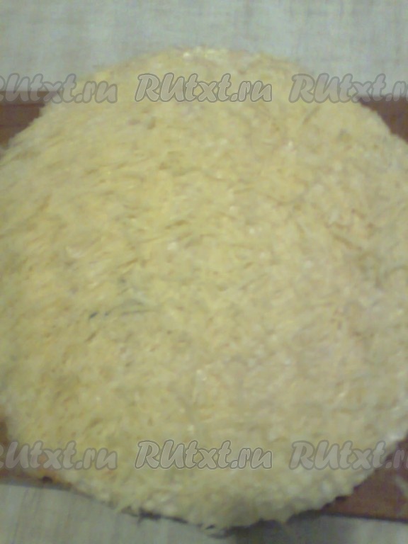 Уложить 4-й вафельный корж, смазать его майонезом. Морковь натереть на средней тёрке. Выложить половину моркови на корж, вторая половина нам понадобится для украшения торта.