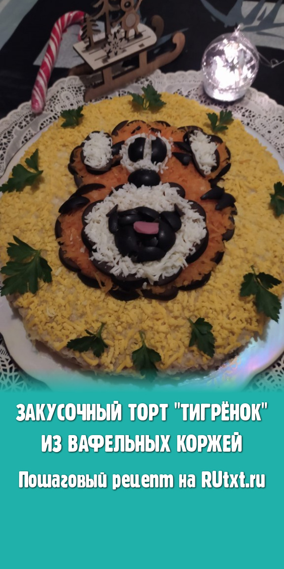 В 2022 наступит год Тигра. Предлагаю приготовить на праздничный стол вкусный и красивый закусочный торт "Тигрёнок" из вафельных коржей на основе салата "Мимоза", который готовится с рыбными консервами, варёной морковью, яйцами, луком, сыром и маринованным огурцом. На новогоднем столе этот закусочный торт будет смотреться просто изумительно.