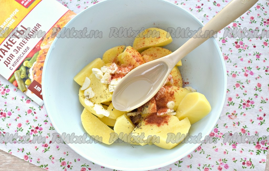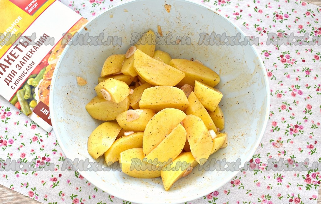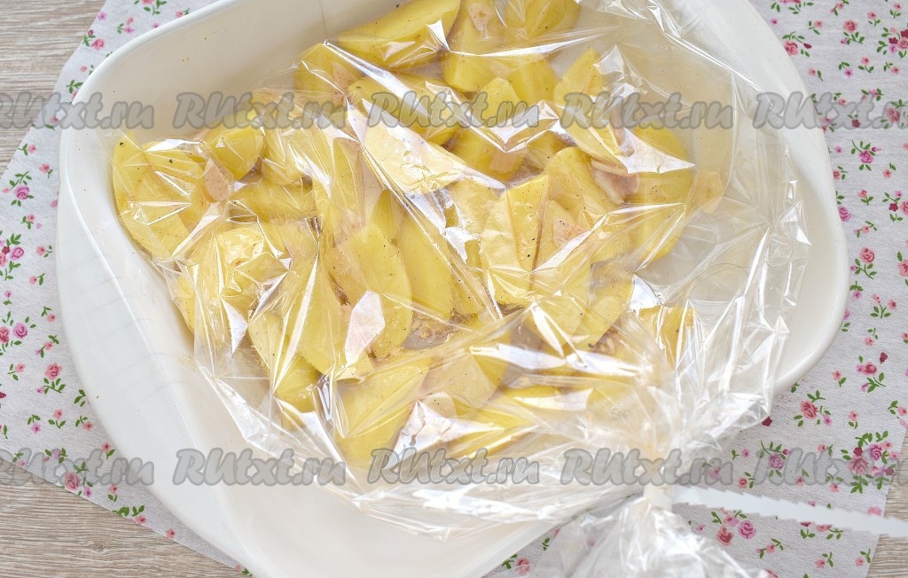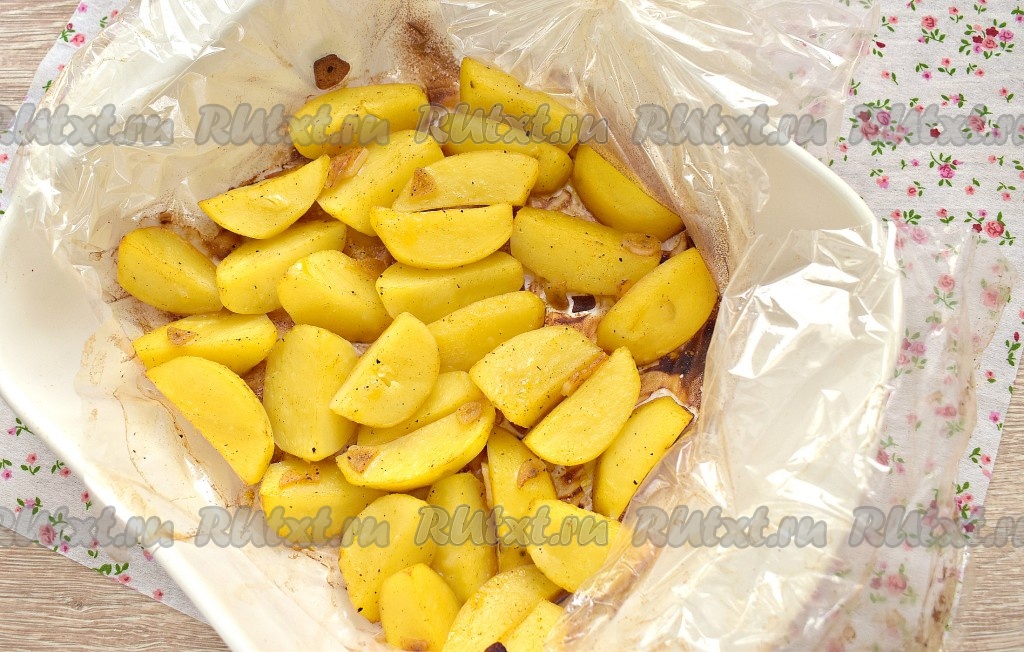 Форму с картофелем в рукаве ставим в разогретую до 200 градусов духовку на 30-40 минут. Спустя это время очень аккуратно, чтобы не обжечься, разрезаем пакет и отправляем картошку в духовку ещё на 10 минут. За это время картофельные дольки подрумянятся.