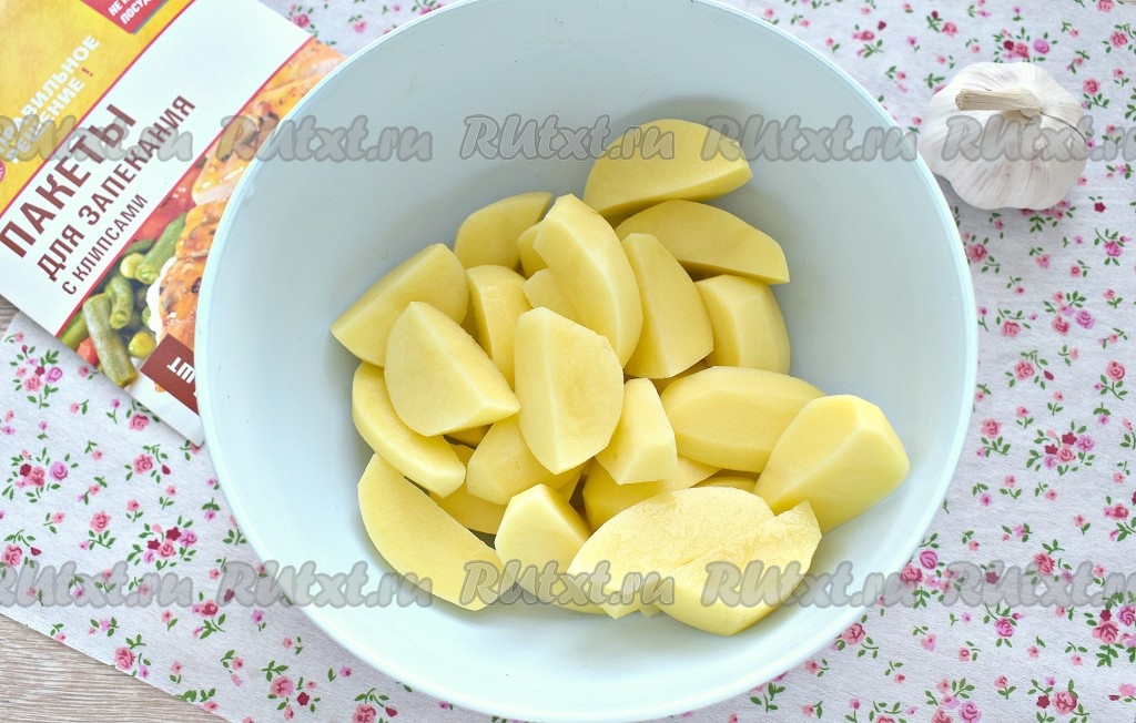 Очищенный картофель нарезаем на средние дольки. Если будете использовать молодой картофель, то просто тщательно вымойте его, от кожуры можно не очищать. Картофельные дольки перекладываем в миску.