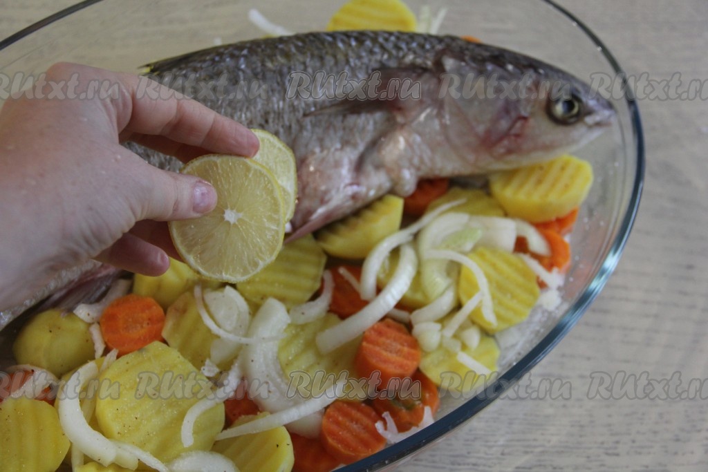 В брюшко кефали вложить пару кружочков лимона.