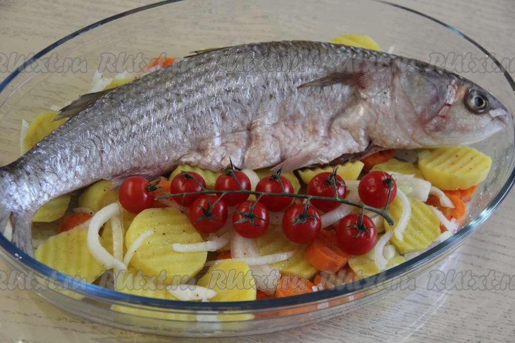 Подготовить продукты. Кефаль предварительно разморозить, затем почистить от чешуи и удалить внутренности. Промыть рыбку и обсушить бумажным полотенцем, затем внутри и снаружи натереть приправой для рыбы, посолить. Картошку, морковь и лук почистить.