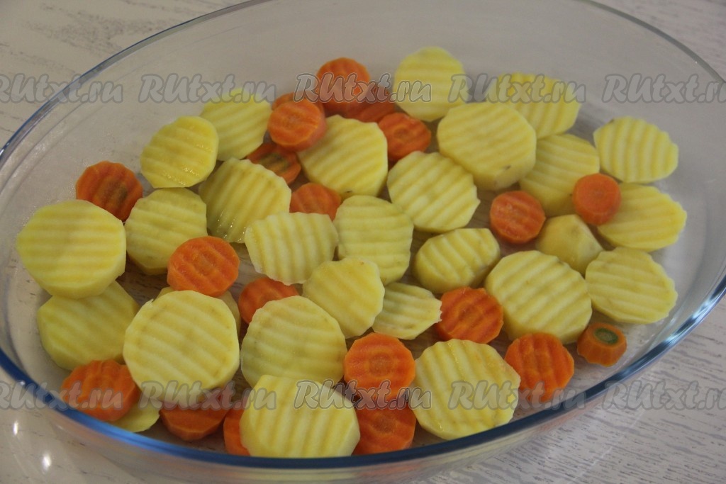 Лук нарезать полукольцами и выложить поверх картошки и моркови.