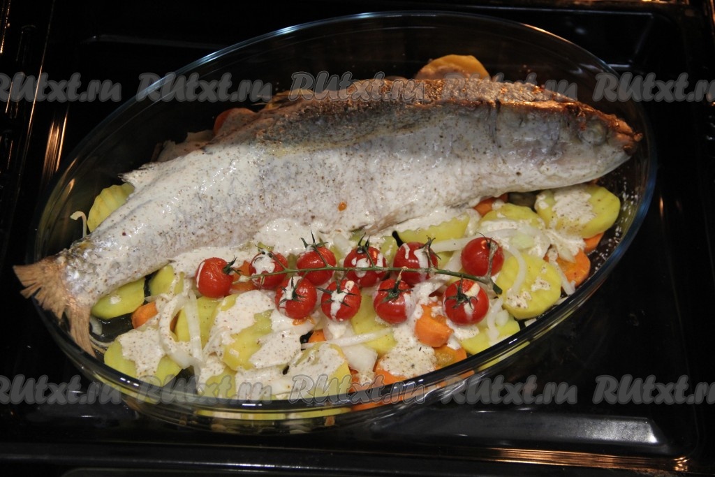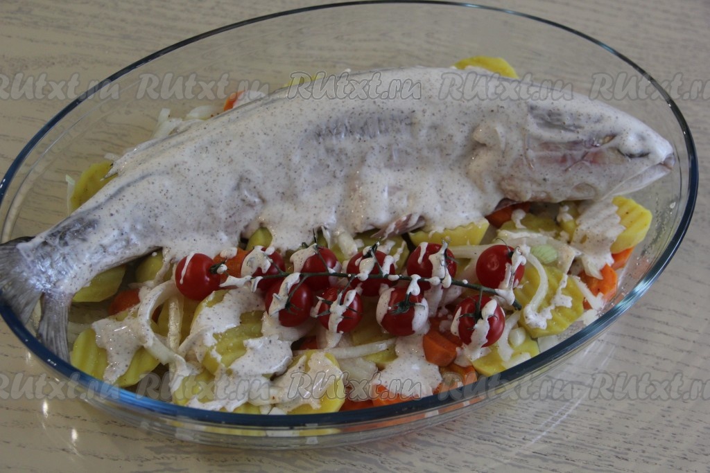 Покрыть кефаль и овощи сверху подготовленным соусом.