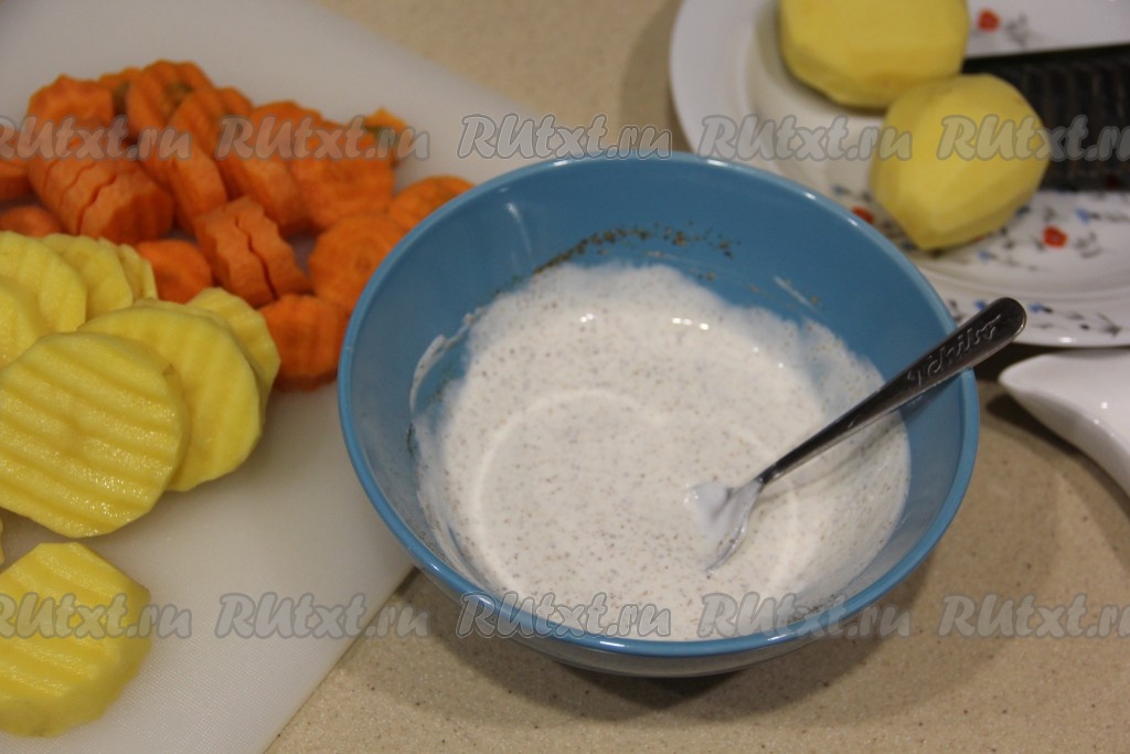 Для приготовления соуса соединить майонез, сметану, можно добавить немного приправы, хорошо перемешать. Картошку и морковь нарезать на крупные дольки, я нарезала на кружочки.