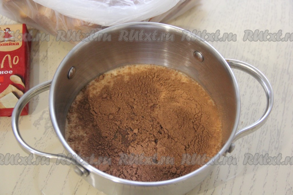 Поставить кастрюлю на огонь и довести содержимое, помешивая, до кипения, затем добавить сливочное масло, перемешать шоколадную смесь до растворения масла, снять с огня, дать немного остыть. Сухари измельчить в блендере.
