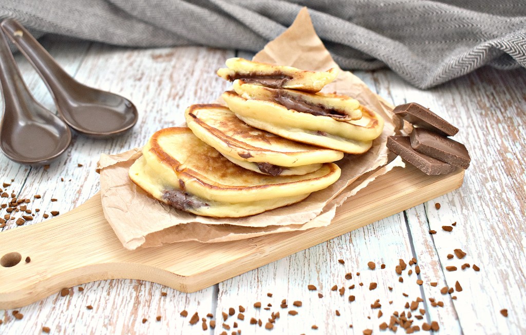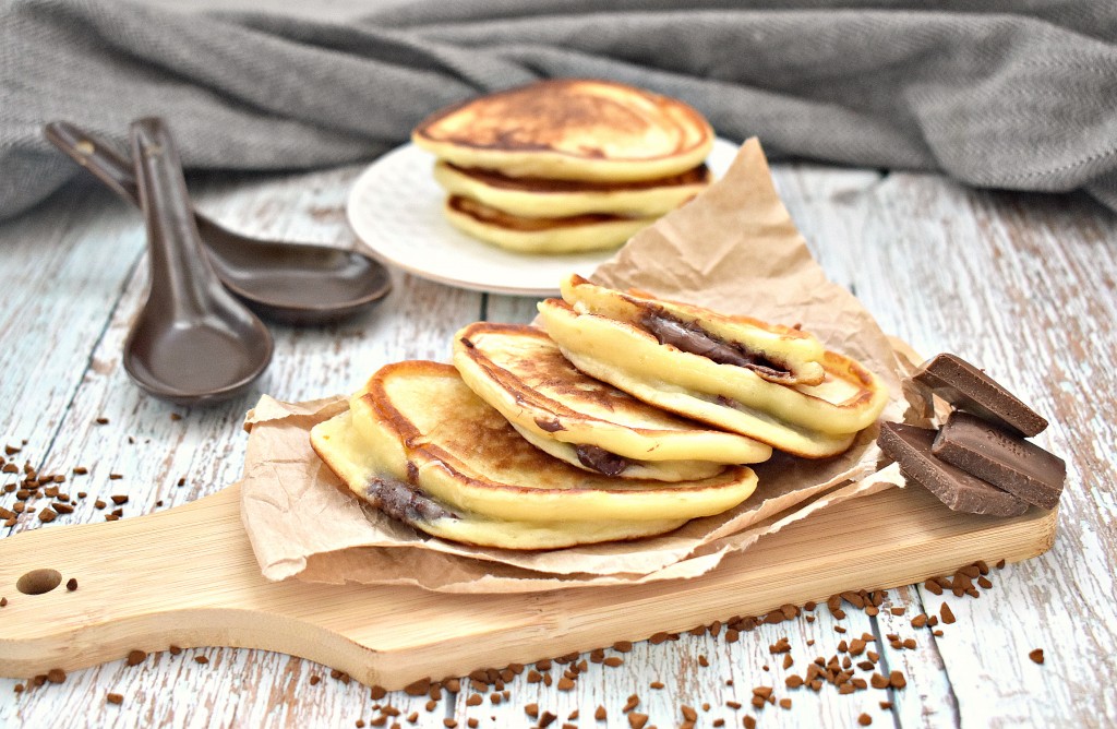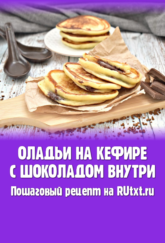Оладьи, замешанные на кефире, неизменно получаются отменными, а благодаря кусочку шоколада, который мы вложили внутрь, они становятся особенно вкусными. К столу их можно подавать и в тёплом, и в остывшем виде.