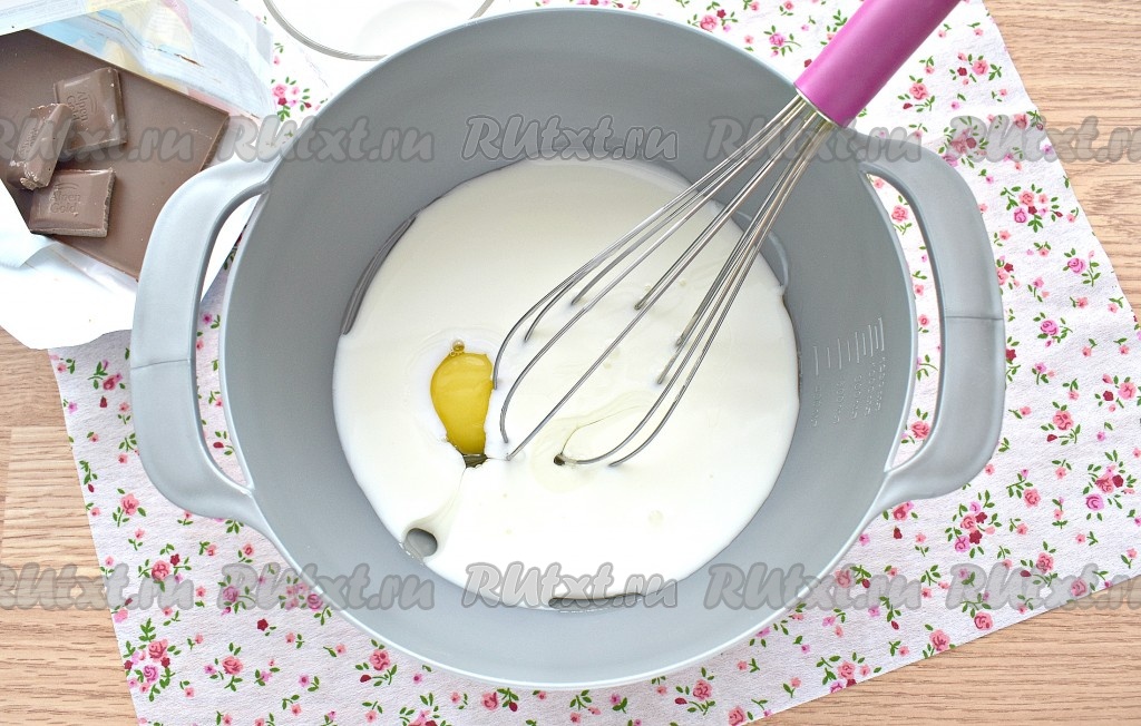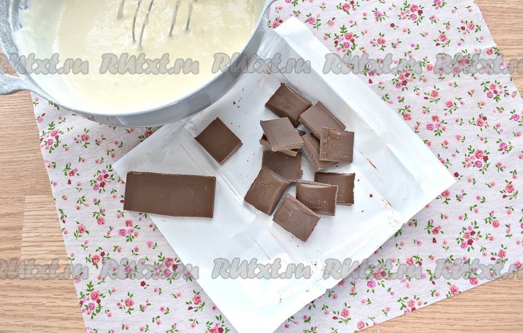 На сковороду вливаем, примерно, 2-3 столовые ложки масла и разогреваем его. Тесто столовой ложкой выкладываем на сковороду. В середину каждой заготовки оладушка кладём по шоколадной дольке. Сверху закрываем шоколад половиной столовой ложки теста.