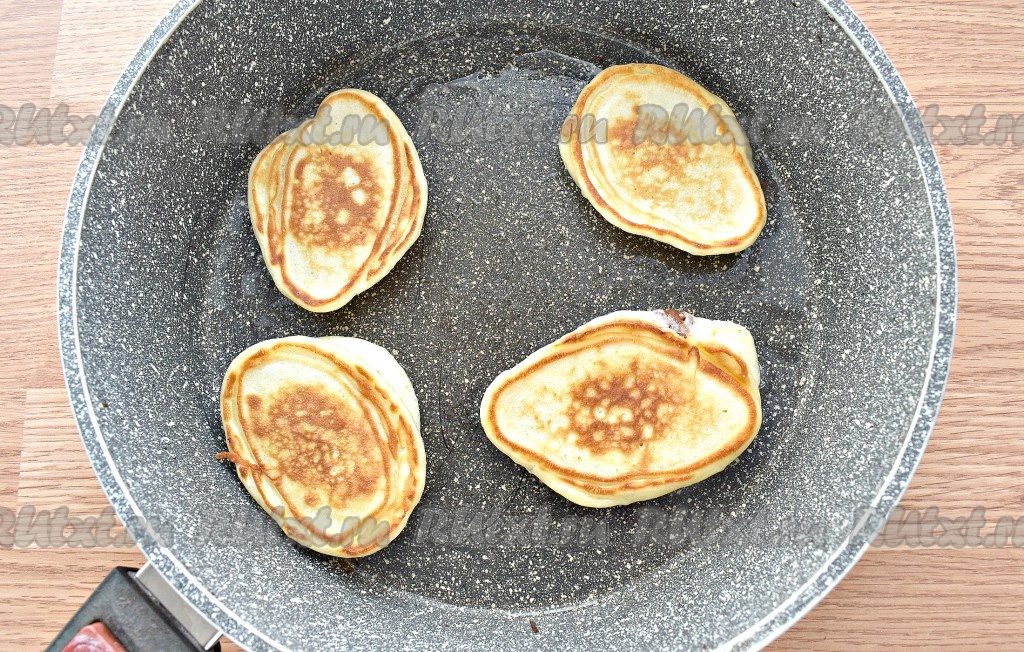 Жарим оладьи с шоколадом с двух сторон до румяности (около 2 минут с каждой стороны) на среднем огне. Готовые оладушки убираем со сковороды, выкладываем на бумажные полотенца, чтобы удалить лишнее масло. Постепенно жарим все оладьи (у меня получилось 12 штук).