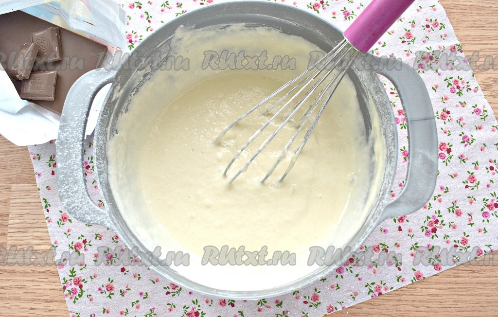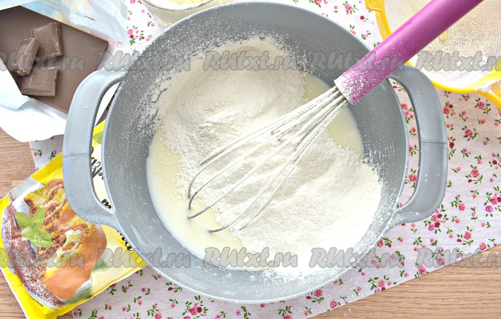В получившуюся смесь просеиваем в 2-3 захода муку вместе с разрыхлителем. Каждый раз тщательно вмешивая муку венчиком.