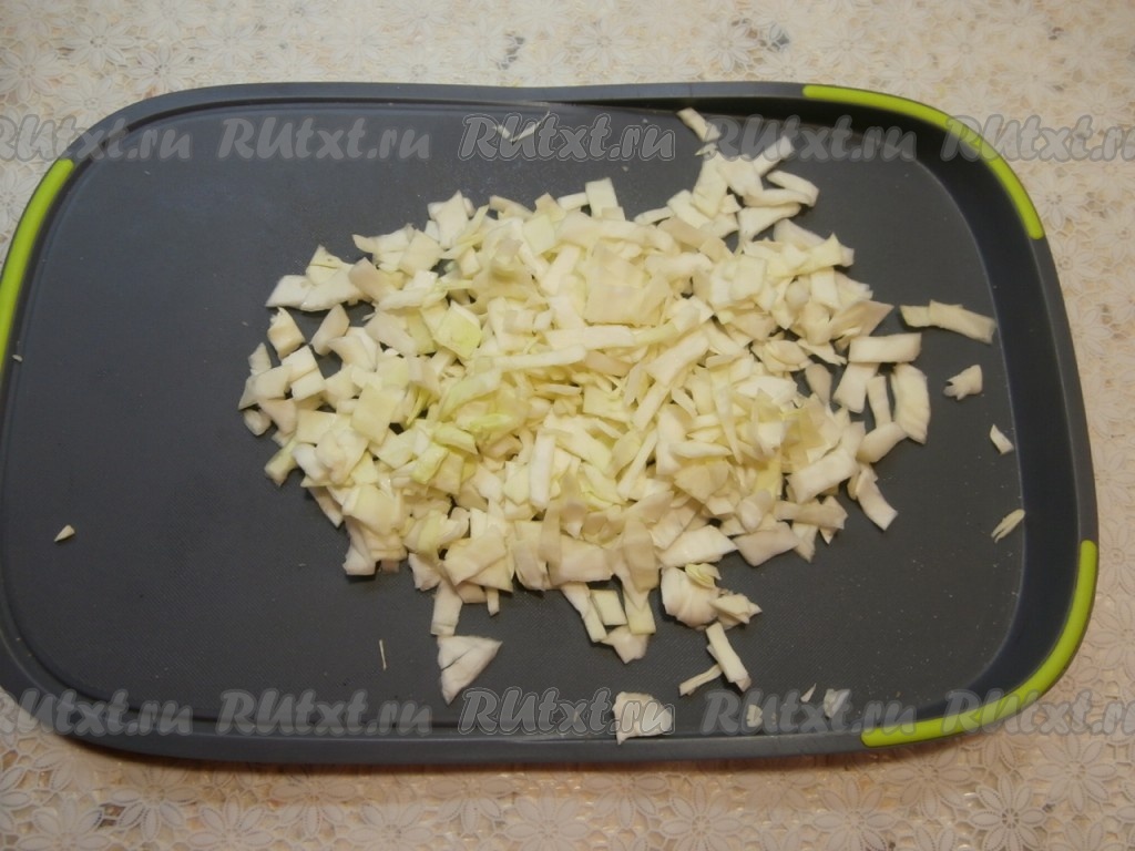 Нашинковать капусту, а затем нарезать её на более мелкие кусочки, чуть посолить и помять руками.