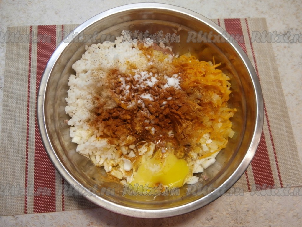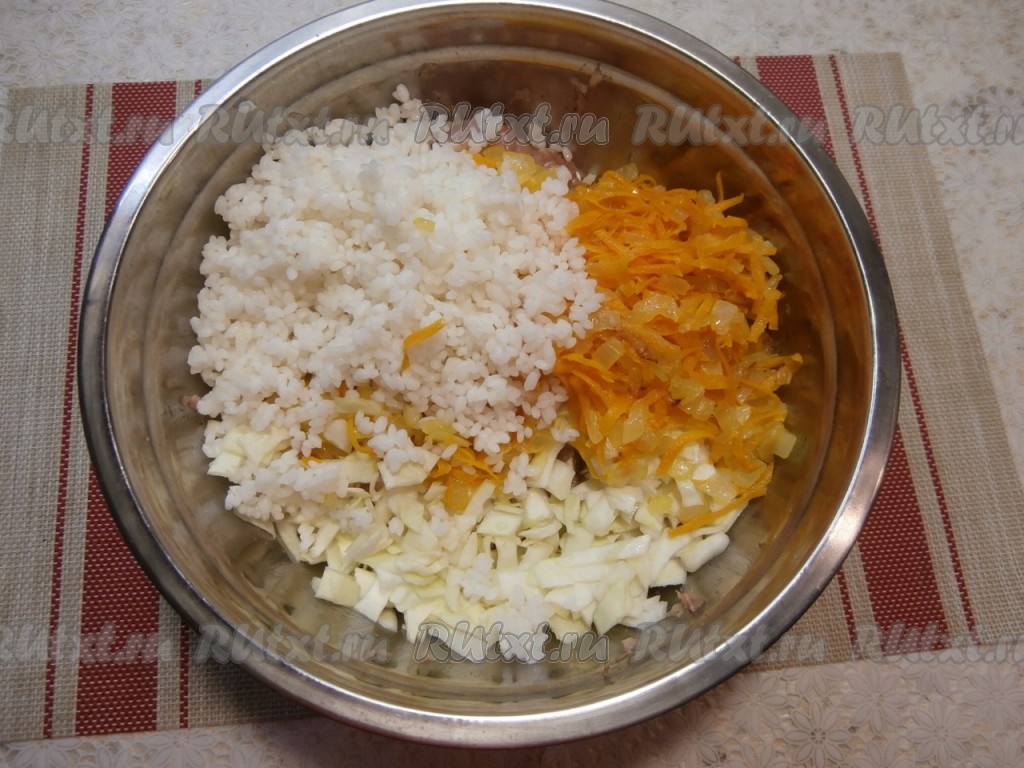 К фаршу добавить капусту, рис и остывшие обжаренные овощи.