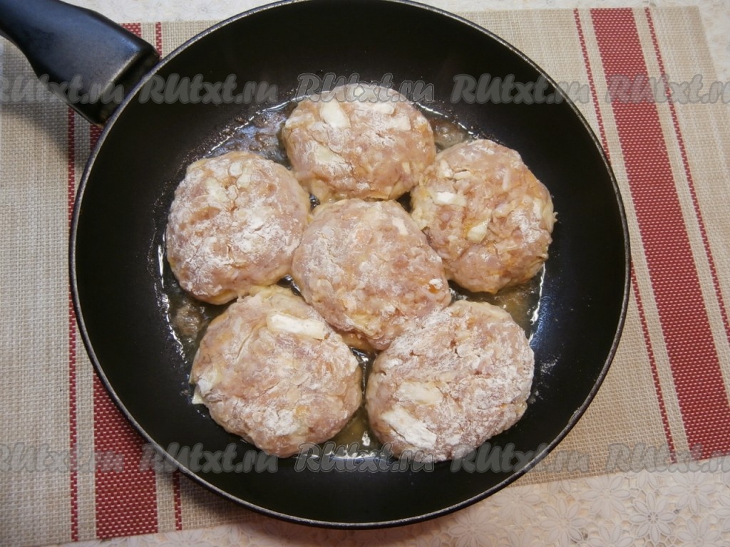 Сформировать из подготовленного фарша достаточно крупные котлеты, а затем со всех сторон обвалять их в муке.