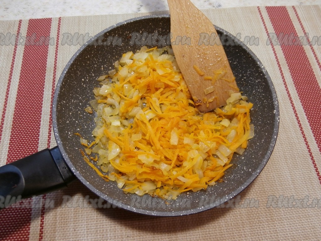 В сковороду влить 2 столовые ложки растительного масла, прогреть, выложить морковку с луком и обжарить до мягкости на среднем огне, помешивая (обычно на это уходит минут 5-6), затем остудить.