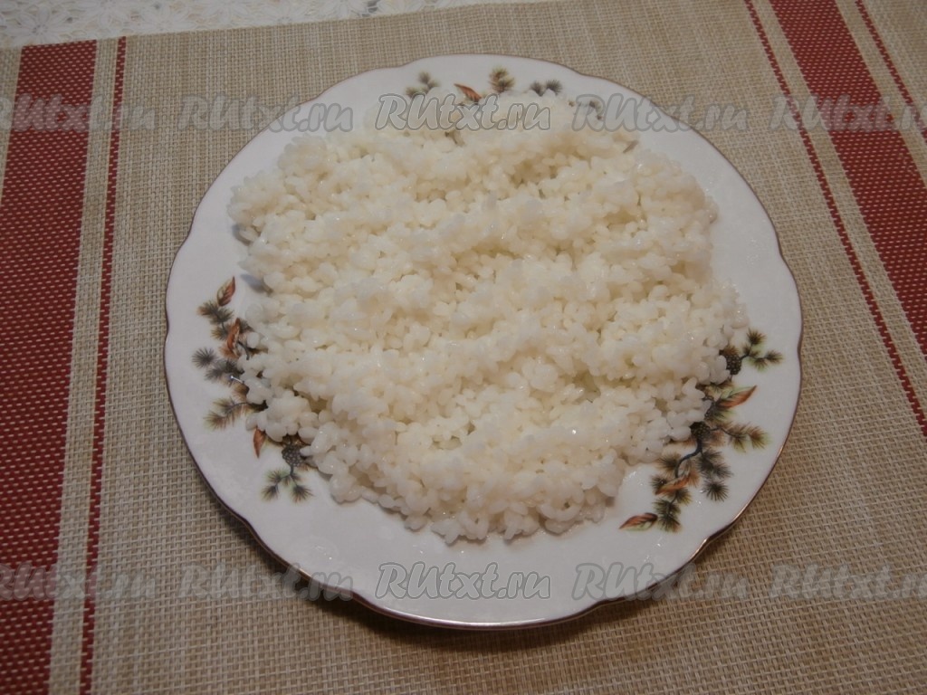 Рис промыть, затем выложить в кастрюлю, залить водой в соотношении 1:2 (воды должно быть в 2 раза больше, чем риса), отправить на огонь, после закипания воду нужно подсолить, уменьшить огонь и варить около 10-12 минут (до полуготовности риса). Отваренный рис промыть холодной водой и оставить на несколько минут в дуршлаге (чтобы с риса стекла жидкость).