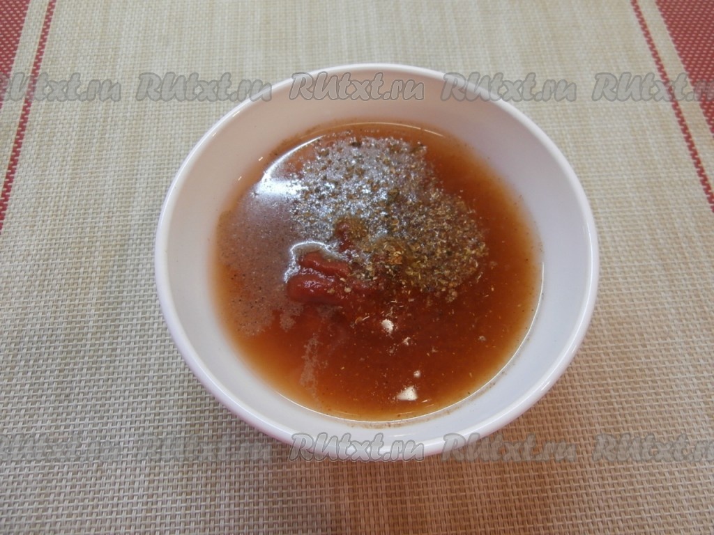 Обжарить ленивые голубцы до румяности с двух сторон на среднем огне. В отдельной глубокой тарелке томатную пасту развести водой, добавить немного специй и молотый чёрный перец, подсолить и перемешать соус.