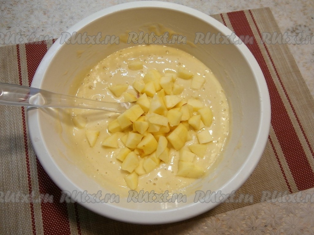 2 яблока, очищенные от семян и кожуры, нарезать на небольшие кубики и добавить в тесто.