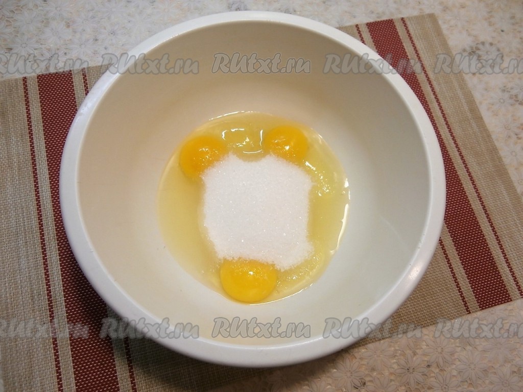 Сырые яйца разбить в миску, добавить к ним соль и сахар.