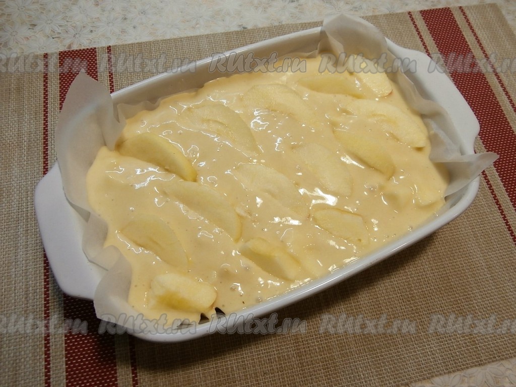 Тесто с яблоками перемешать и вылить в форму, застеленную пергаментом (у меня форма размером 16 см на 23 см). Сверху выложить оставшееся очищенное яблоко, нарезанное дольками.
