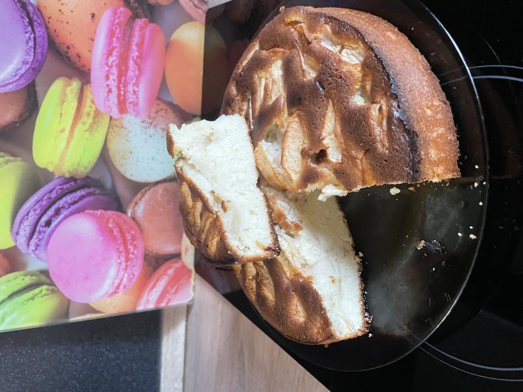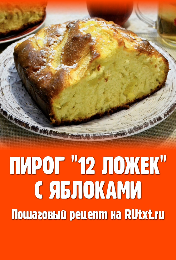 Пышному, очень вкусному, нежнейшему пирогу "12 ложек" с яблоками дать остыть, затем немного присыпать его сахарной пудрой, нарезать и подать к чаю.