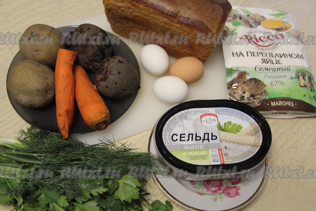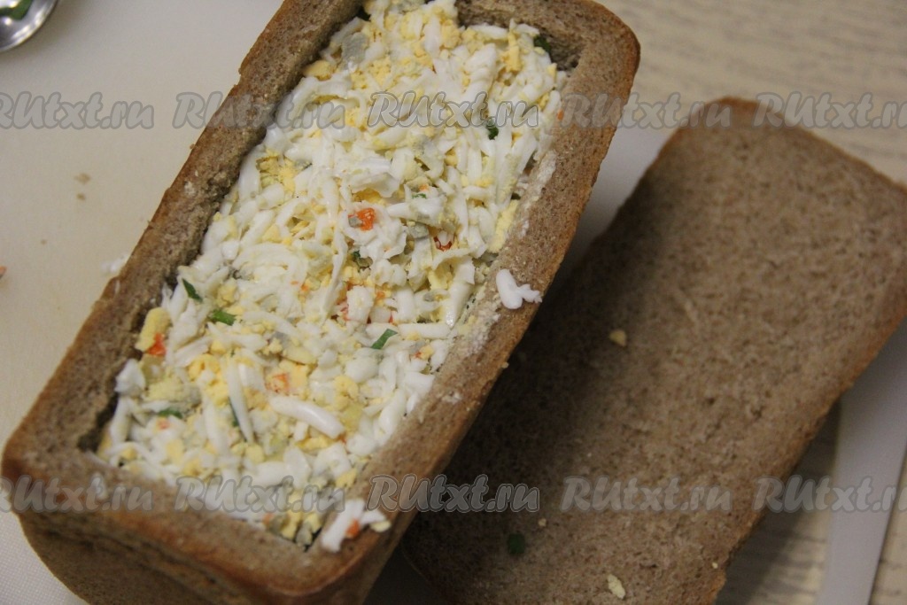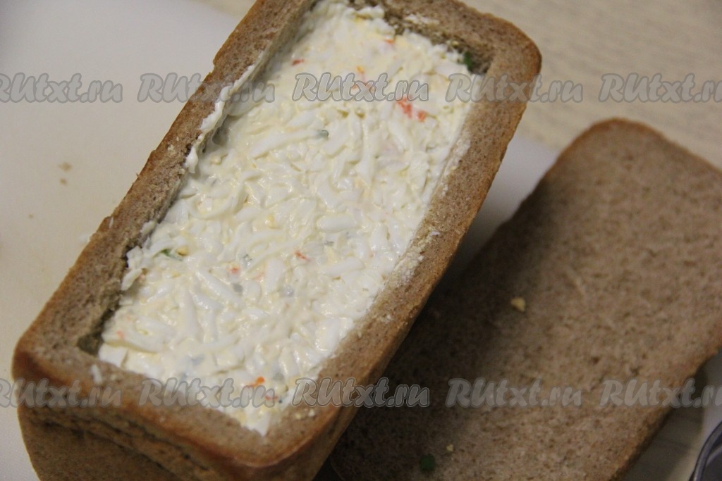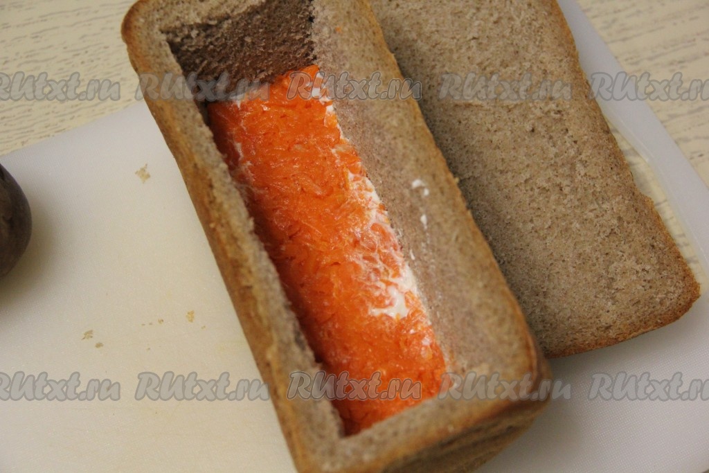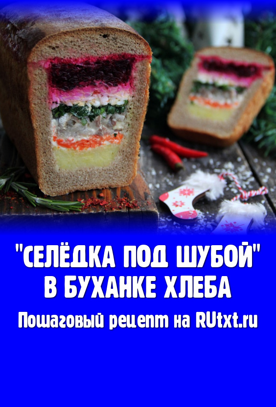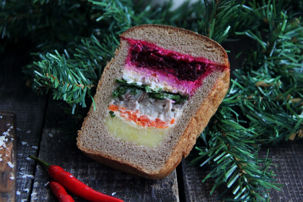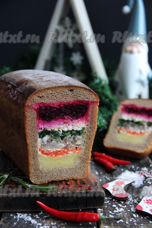 В преддверии праздников хочу предложить рецепт яркой и вкусной закуски. Оригинальность этого блюда в том, что любимый многими салат "Селёдка под шубой" формируется в буханке чёрного хлеба, отправляется на несколько часов в холодильник, а затем нарезается на бутерброды и подаётся к столу. Такая закуска отлично режется, прекрасно держит форму. Бутербродики получаются красивыми, сытными, аппетитными и очень вкусными. Они интересно смотрятся на праздничном столе. Всем советую приготовить закуску по этому рецепту!