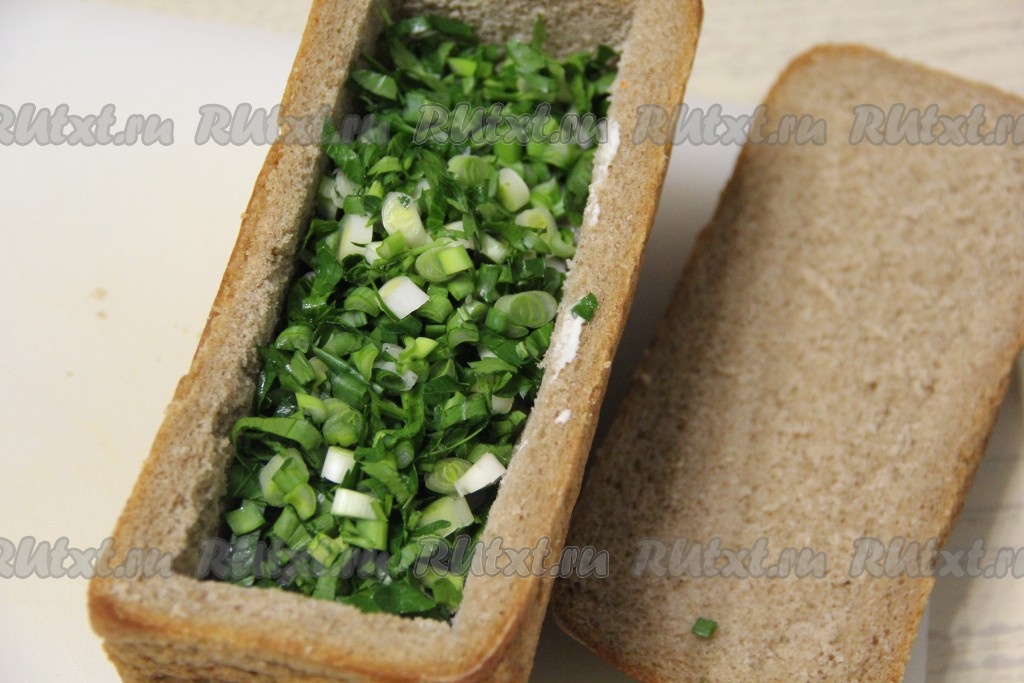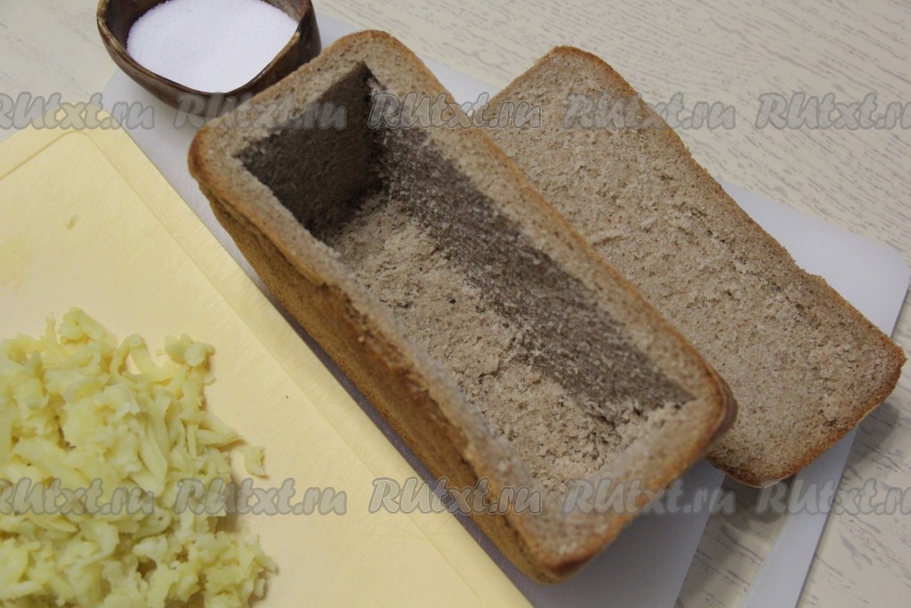 С буханки чёрного хлеба срезать верхушку. Удалить мякоть из буханки. Должна получиться хлебная коробочка, как на фото. Картошку натереть на тёрке.