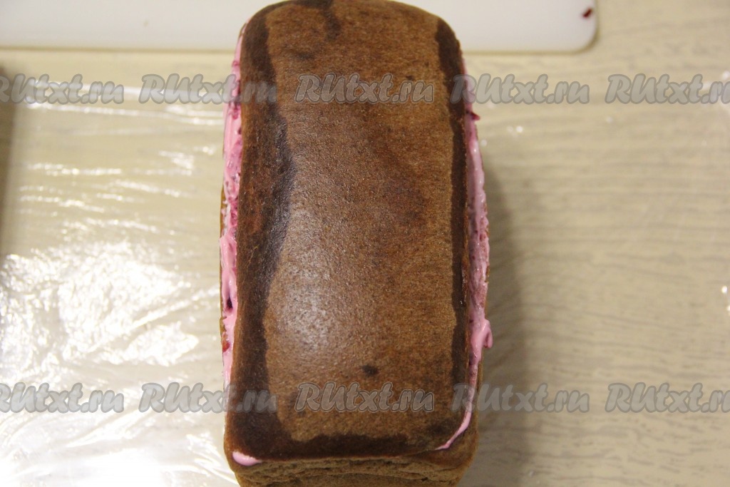 Перед подачей снять пищевую пленку и нарезать буханку на кусочки. На фото видно, каким красивым в разрезе получается это блюдо.