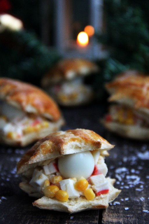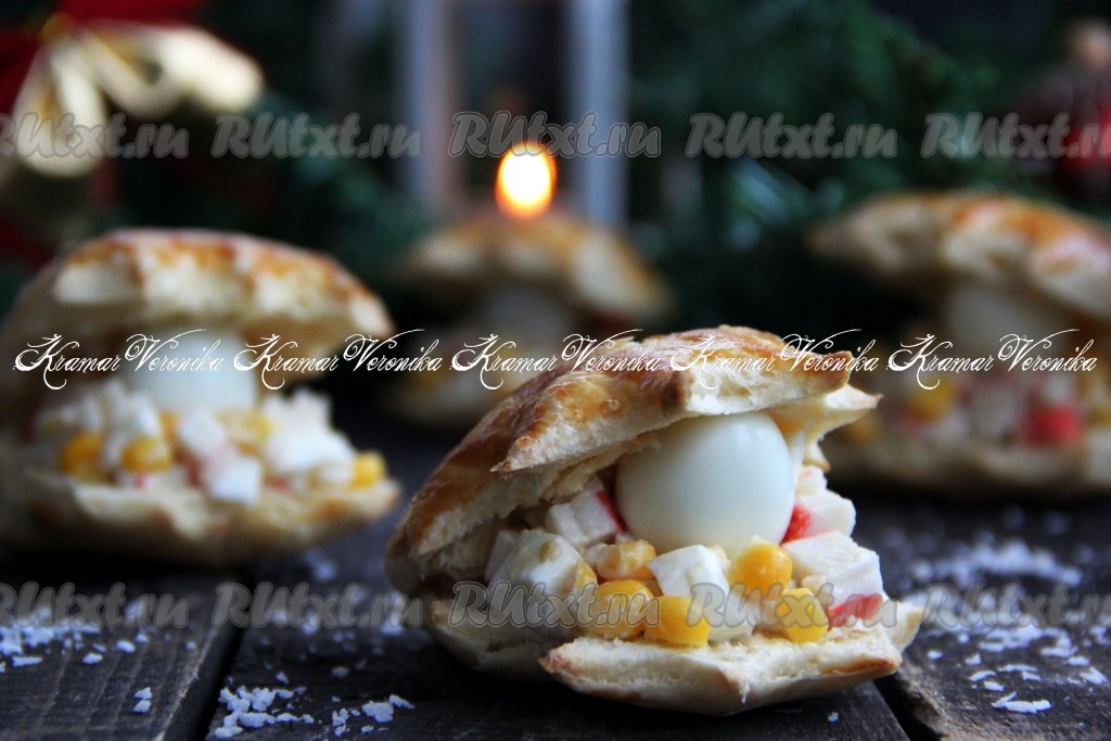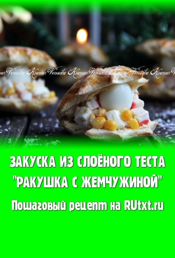 На праздничный стол можно приготовить красивую закуску, которая очень напоминает ракушки с жемчужинами. Ракушки испечём из слоёного теста, а затем начиним их салатом. Начинкой для таких ракушек может быть практически любой салатик. Я приготовила простой салат с крабовыми палочками, яйцами и рисом. Но здесь можно экспериментировать, например, подойдёт "Оливье" - но выбор начинки это уже дело вкуса. В качестве жемчужины я положила в каждую ракушку по перепелиному яйцу, но можно яйца заменить на чёрные маслины без косточек. Такая красивая закуска отлично смотрится на праздничном столе, да и на вкус она очень хороша!
