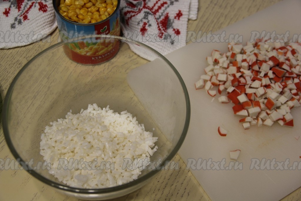 Пока ракушки остывают, можно заняться начинкой закуски. Остывший рис выложить в достаточно глубокую миску. Крабовые палочки мелко нарезать и выложить к рису.