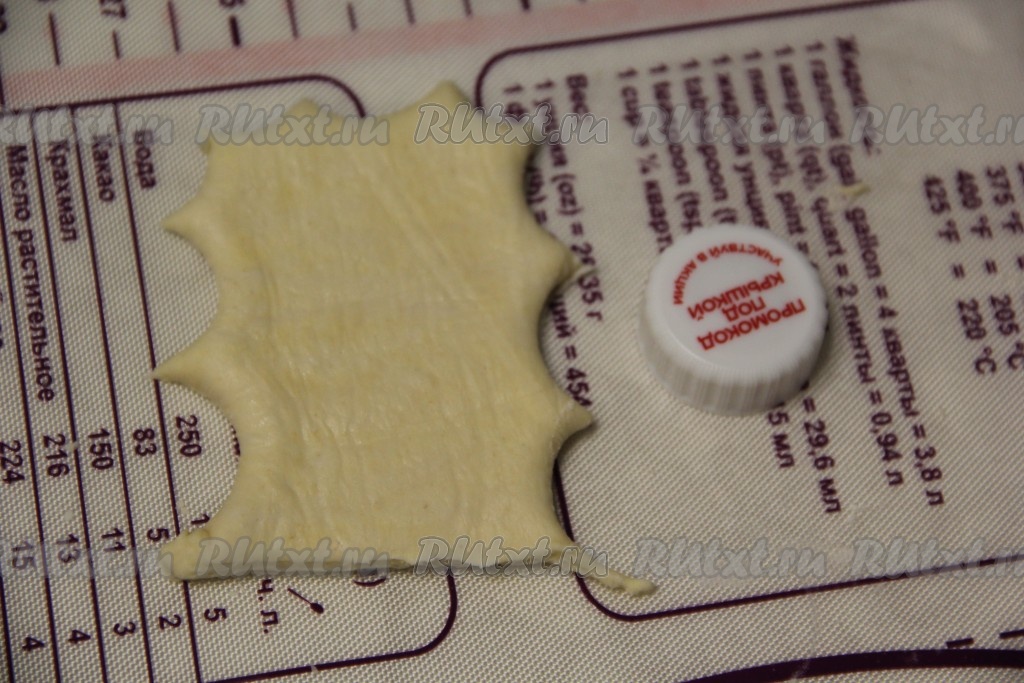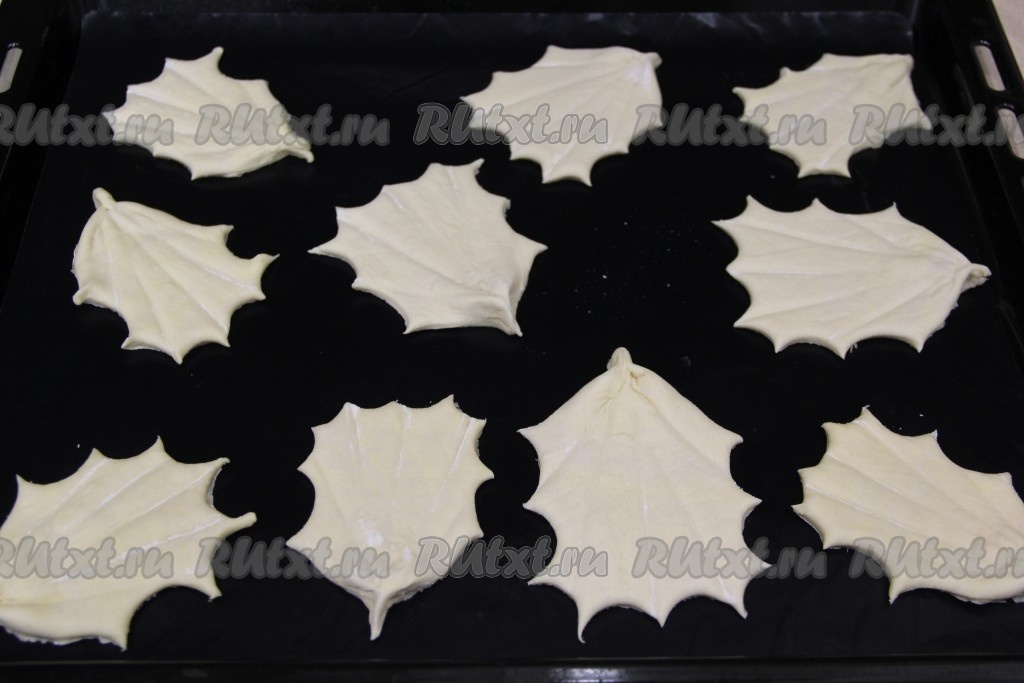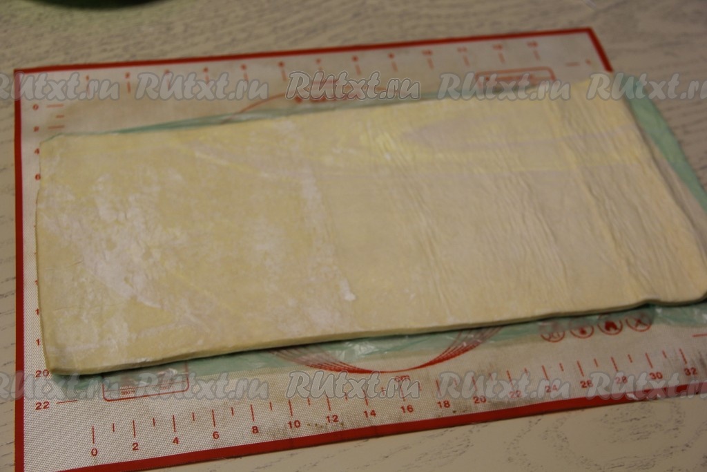 Тесто у меня было в рулоне, я просто его разморозила и развернула в один длинный пласт на поверхности, присыпанной мукой.