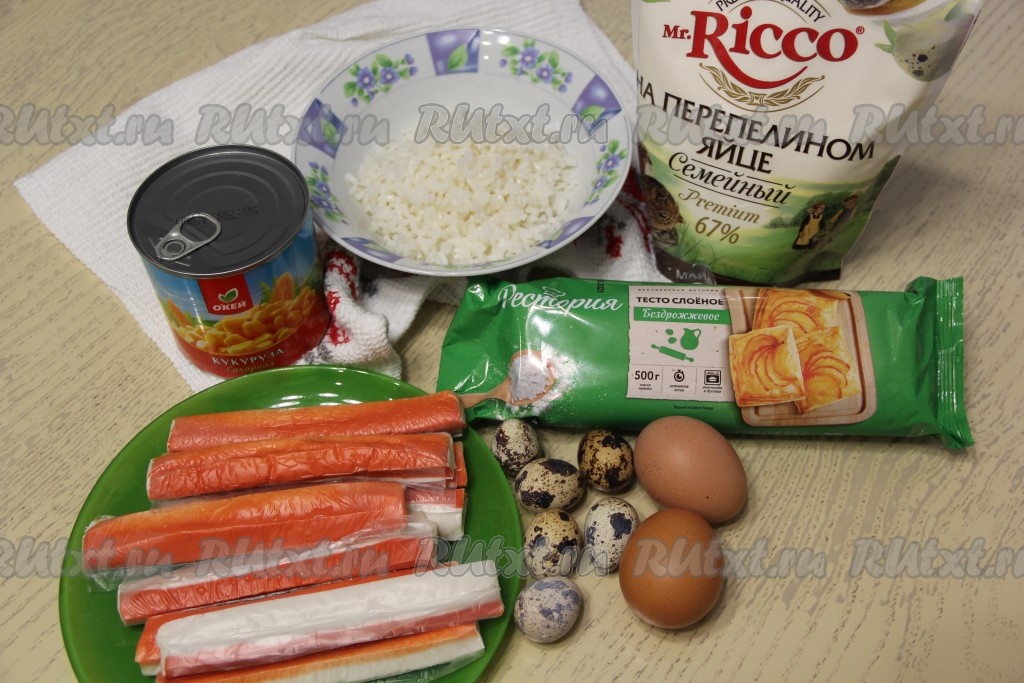 Подготовить продукты. Слоёное тесто и крабовые палочки предварительно разморозить при комнатной температуре. Рис заранее отварить до готовности.