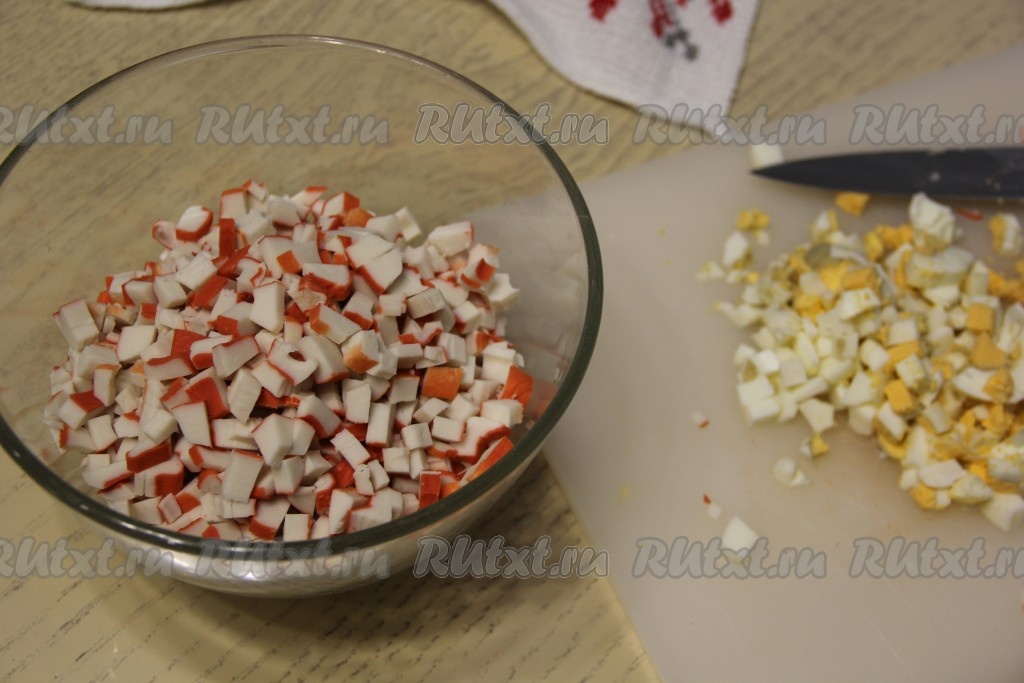 В эту же миску добавить мелко нарезанные яйца.