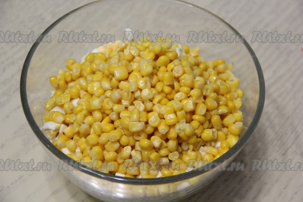 В миску с рисом, яйцам и крабовыми палочками выложить кукурузу без жидкости, добавить майонез, посолить по вкусу и перемешать.