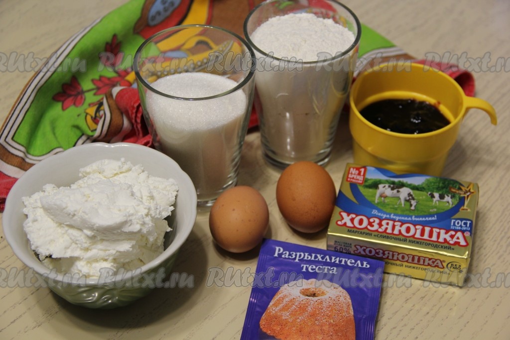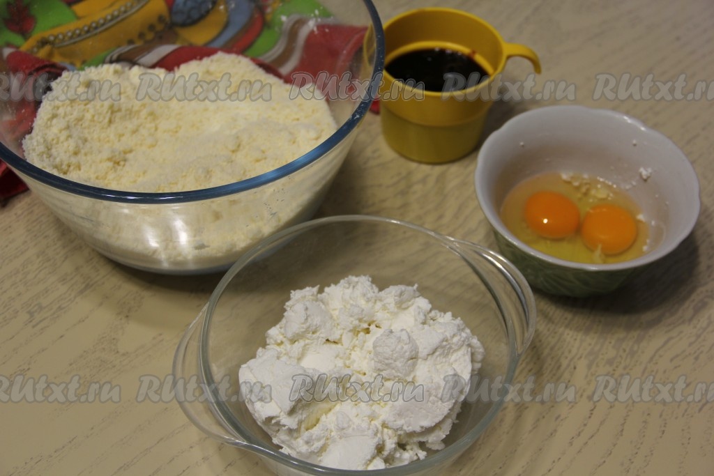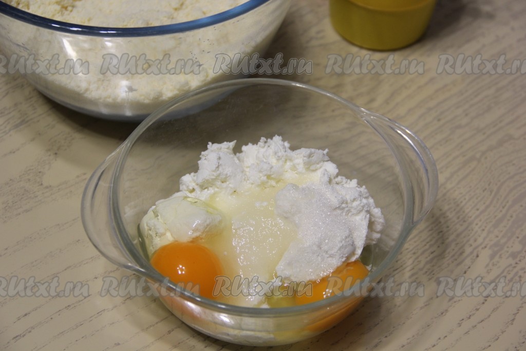 Для приготовления начинки в отдельной миске соединить творог, сахар и яйца.